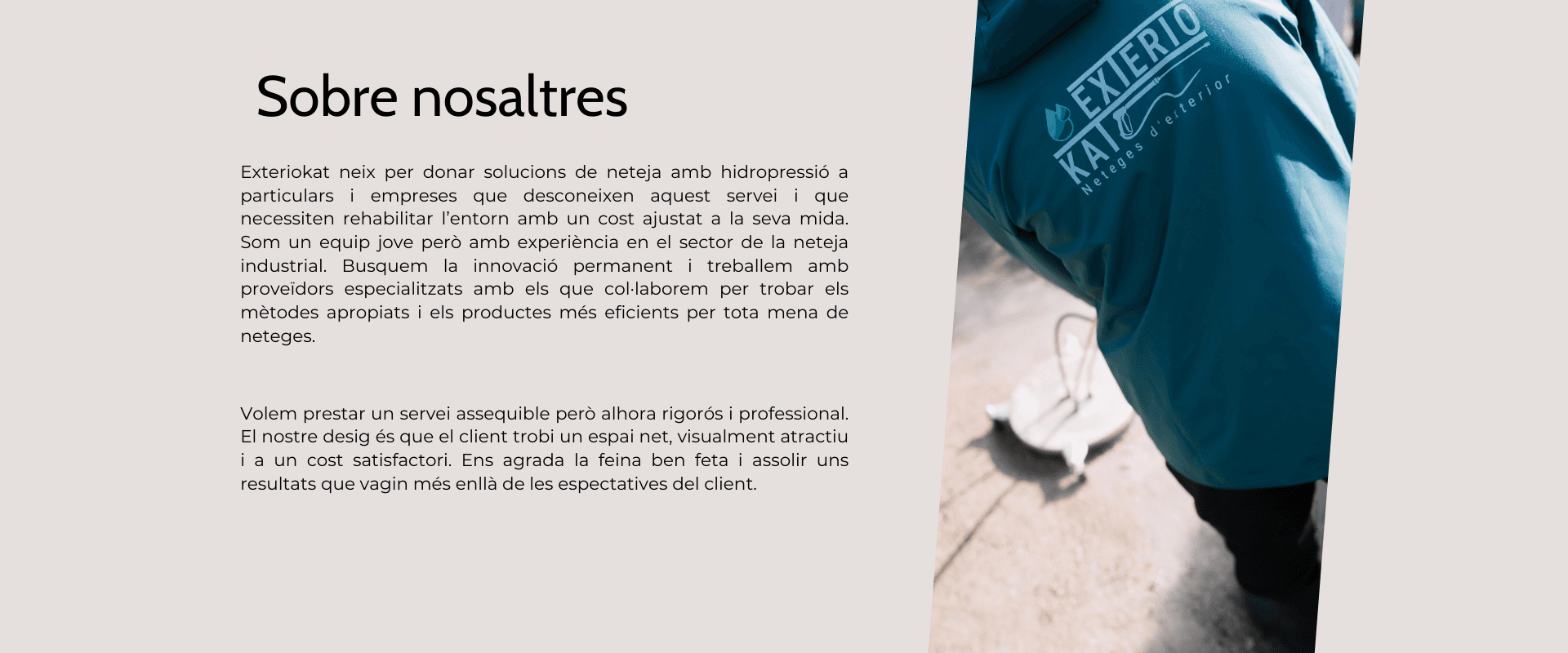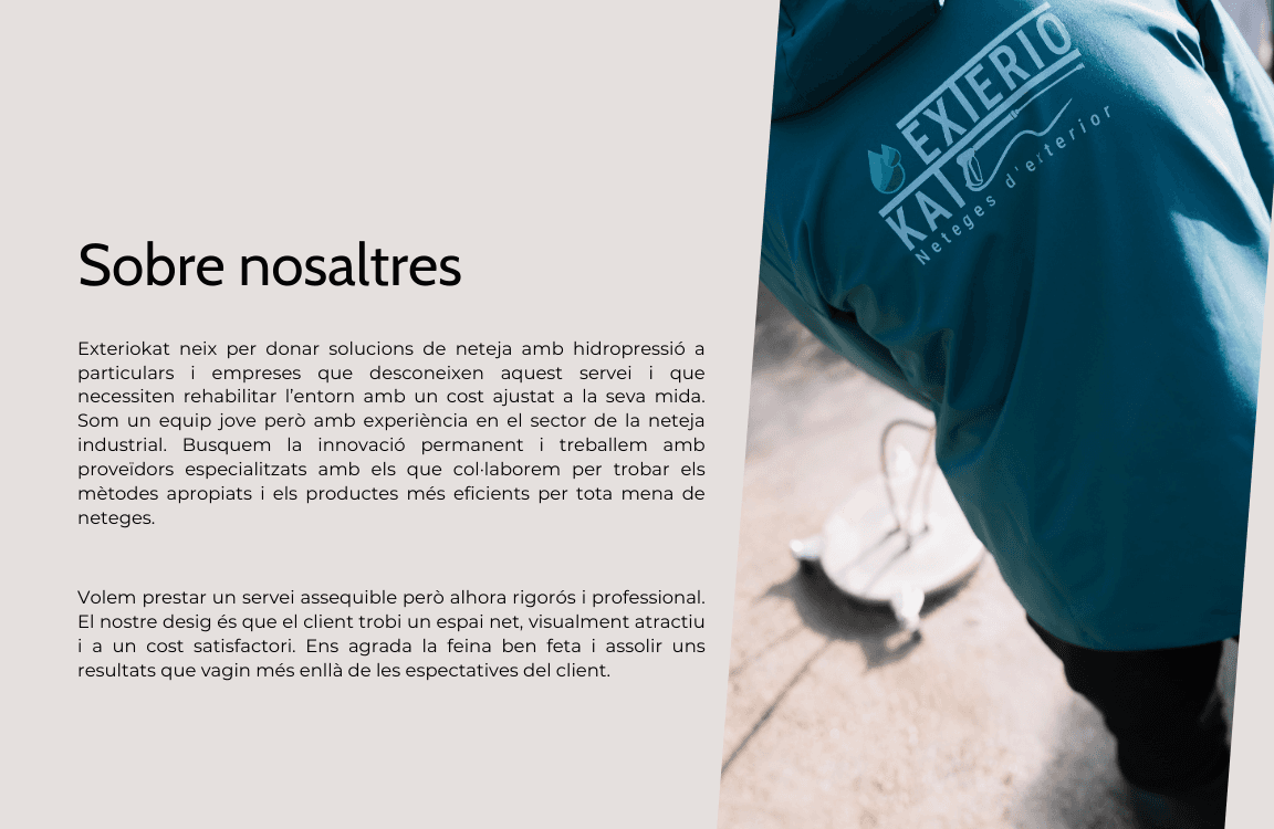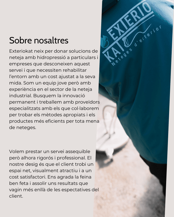 Estem especialitzats en neteges exteriors amb hidronetejadora d’alta pressió en tota classe de superfícies i espais. Treiem la brutícia acumulada per la contaminació i residus de l’entorn. Disposem de maquinària professional per preservar i embellir els espais tractats, millorant l’estètica, la utilitat i la perdurabilitat dels mateixos.